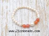 Details: Fashion pearl bracelet: 6mm-7mm/7mm-8mm potato white freshwater pearls & 8mm round fire agate beaded stretchy bracelet jewelry Item: CFB609 Material: potato white freshwater pearls 8mm fire agate 1.5*4mm copper spacers Color: See image Style: No.1: 6-7mm potato white freshwater pearls (Default) No.2: 7-8mm potato white freshwater pearls (you can choose different spacer & style) Length (inch): Approx 7.5 inch (Default) You can choose 6.5”; 7”; 8”; 8.5”; 9” or 9.5” Quantity Discount Pricing: 1 – 4: None 5 – 49: 95% 50 – 99: 90% 100+: 85% The listed price is for 1 piece style #1 7.5 inch bracelet If you also like similar necklace, please order item CFN114 Custom orders are available upon request! The picture is for reference only, there will be tiny different in shape, color or quality for some products from different date code. we will send your orders randomly according to our stock