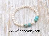 Details: Fashion pearl bracelet: 6mm-7mm/7mm-8mm potato white freshwater pearls & 8mm round blue sea sediment jasper beaded stretchy bracelet jewelry Item: CFB614 Material: potato white freshwater pearls 8mm blue sea sediment jasper 1.5*4mm copper spacers Color: See image Style: No.1: 6-7mm potato white freshwater pearls (Default) No.2: 7-8mm potato white freshwater pearls (you can choose different spacer & style) Length (inch): Approx 7.5 inch (Default) You can choose 6.5”; 7”; 8”; 8.5”; 9” or 9.5” Quantity Discount Pricing: 1 – 4: None 5 – 49: 95% 50 – 99: 90% 100+: 85% The listed price is for 1 piece style #1 7.5 inch bracelet If you also like similar necklace, please order item CFN106 Custom orders are available upon request! The picture is for reference only, there will be tiny different in shape, color or quality for some products from different date code. we will send your orders randomly according to our stock