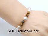 Details: Fashion pearl bracelet: 6mm-7mm/7mm-8mm potato white freshwater pearls & 8mm round yellow tiger eye beaded stretchy bracelet jewelry Item: CFB618 Material: potato white freshwater pearls 8mm yellow tiger eye 1.5*4mm copper spacers Color: See image Style: No.1: 6-7mm potato white freshwater pearls (Default) No.2: 7-8mm potato white freshwater pearls (you can choose different spacer & style) Length (inch): Approx 7.5 inch (Default) You can choose 6.5”; 7”; 8”; 8.5”; 9” or 9.5” Quantity Discount Pricing: 1 – 4: None 5 – 49: 95% 50 – 99: 90% 100+: 85% The listed price is for 1 piece style #1 7.5 inch bracelet If you also like similar necklace, please order item CFN116 Custom orders are available upon request! The picture is for reference only, there will be tiny different in shape, color or quality for some products from different date code. we will send your orders randomly according to our stock