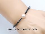Details: Fashion gemstone & pearl bracelet: 4mm faceted round tiny black tourmaline & 10 - 11mm potato white freshwater pearl beaded bracelet Item: CFB825 Material: 4mm faceted round black tourmaline 10-11mm potato white freshwater pearls 1.5*4mm copper spacers 7*12m copper lobster clasp(Style #2) (you can choose different spacer & clasp, if you like sterling silver clasp, other clasp or better quality potato white freshwater pearls we don't show, please contact us before you placing order) Color: See image Style: No.1: Stretchy bracelet (Default) No.2: Adjustable bracelet Length (inch): Approx 6 inch You can choose 6.5”; 7”; 7.5”; 8”; 8.5” or 9” Quantity Discount Pricing: 1 - 4: None 5 - 49: 95% 50 - 99: 90% 100+: 85% The listed price is for 1 piece 6 inch bracelet. Custom orders are available upon request! The picture is for reference only, there will be tiny different in shape, color or quality for some products from different date code. we will send your orders randomly according to our stock