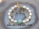 Details: Fashion pearl bracelet: 9mm - 10mm rice white freshwater pearls & 12mm round amazonite beaded bracelet finished with copper OT clasp (Style No.4) Item: CFB939 Material: 9-10mm rice white freshwater pearls 12mm round amazonite beads 1.5*4mm copper spacers (No.2) Color: See image Style: No.1-No.3: Stretchy No.4-No.6: Hand-knotted (you can choose different style, spacer & clasp. if you like other style, clasp, spacer or other quality/size rice white freshwater pearls we don't show, please contact us before you placing order) Length (inch): Approx 7.5 inch (Default) You can choose 6.5”; 7”; 7.5”; 8”; 8.5”; 9” or 9.5” Quantity Discount Pricing: 1 - 4: None 5 - 49: 95% 50 - 99: 90% 100+: 85% The listed price is for 1 piece 6.5 inch style No.1 bracelet; the picture shows style No.4 Custom orders are available upon request! The picture is for reference only, there will be tiny different in shape, color or quality for some products from different date code. we will send your orders randomly according to our stock
