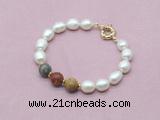 Details: Fashion pearl bracelet: 9mm - 10mm rice white freshwater pearls & 10mm round picasso jasper beaded bracelet finished with copper spring ring clasp (Style No.5) Item: CFB949 Material: 9-10mm rice white freshwater pearls 10mm round picasso jasper beads 2*5mm copper spacers (No.4) Color: See image Style: No.1-No.3: Stretchy No.4-No.6: Hand-knotted (you can choose different style, spacer & clasp. if you like other style, clasp, spacer or other quality/size rice white freshwater pearls we don't show, please contact us before you placing order) Length (inch): Approx 7.5 inch (Default) You can choose 6.5”; 7”; 7.5”; 8”; 8.5”; 9” or 9.5” Quantity Discount Pricing: 1 - 4: None 5 - 49: 95% 50 - 99: 90% 100+: 85% The listed price is for 1 piece 6.5 inch style No.1 bracelet; the picture shows style No.5 Custom orders are available upon request! The picture is for reference only, there will be tiny different in shape, color or quality for some products from different date code. we will send your orders randomly according to our stock