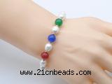 Details: Fashion pearl bracelet: 9mm - 10mm rice white freshwater pearls & 10mm round mixed candy jade beaded bracelet finished with copper OT clasp (Style No.6) Item: CFB998 Material: 9-10mm rice white freshwater pearls 10mm round mixed candy jade beads 1.5*4mm copper spacers (No.1) Color: See image Style: No.1-No.3: Stretchy No.4-No.6: Hand-knotted (you can choose different style, spacer & clasp. if you like other style, clasp, spacer or other quality/size rice white freshwater pearls we don't show, please contact us before you placing order) Length (inch): Approx 7.5 inch (Default) You can choose 6.5”; 7”; 7.5”; 8”; 8.5”; 9” or 9.5” Quantity Discount Pricing: 1 - 4: None 5 - 49: 95% 50 - 99: 90% 100+: 85% The listed price is for 1 piece 6.5 inch style No.1 bracelet; the picture shows style No.6 Custom orders are available upon request! The picture is for reference only, there will be tiny different in shape, color or quality for some products from different date code. we will send your orders randomly according to our stock