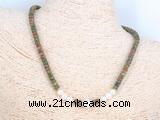Details: Fashion gemstone & pearl jewelry: 4*6mm faceted rondelle unakite & potato white freshwater pearl necklace finished with copper lobster clasp Item: CFN215 Material: Style #1: 7-8mm & 10-11mm potato white freshwater pearls Style #2: 10-11mm potato white freshwater pearls 4*6mm faceted rondelle unakite 1.5*4mm copper spacers Copper lobster clasp(#3) (you can choose different spacer & clasp, if you like sterling silver clasp or other clasp we don't show, please contact us before you placing order) Color: See image Length (inch): Approx 17 inch (Default, Include the clasp, but not including Tail Chain) You can choose 18”; 19”; 20”; 22” or 24” Quantity Discount Pricing: 1 – 4: None 5 – 49: 95% 50 – 99: 90% 100+: 85% The listed price is for 1 piece Style #1 17 inch necklace Custom orders are available upon request! The picture is for reference only, there will be tiny different in shape, color or quality for some products from different date code. we will send your orders randomly according to our stock