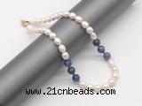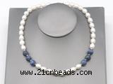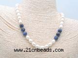 Details: Fashion pearl necklace: 16 - 24 inches 9mm - 10mm rice white freshwater pearls & sodalite beaded necklace finished with copper spring ring clasp Item: CFN316 Material: 9-10mm rice white freshwater pearls 10mm round sodalite beads 1.5*4mm copper spacers (No.2) 11mm copper spring ring clasp (you can choose different spacer & clasp, if you like sterling silver clasp, other clasp or better quality rice white freshwater pearls we don't show, please contact us before you placing order) Color: See image Style: No.1: Non-knotted (Default) No.2: Hand-knotted Length (inch): Approx 16 inch (16-17”, Default) You can choose 17”(17-18”); 18”(18-19”); 19”(19-20”); 20”(20-21”); 22”(22-23”) or 24”(24-25”) Quantity Discount Pricing: 1 – 4: None 5 – 49: 95% 50 – 99: 90% 100+: 85% The listed price is for 1 piece Style #1(Non-knotted) 16 inch necklace; The picture shows 17 inch necklace Custom orders are available upon request! The picture is for reference only, there will be tiny different in shape, color or quality for some products from different date code. we will send your orders randomly according to our stock