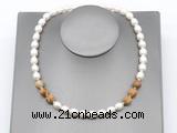 Details: Fashion pearl necklace: 16 - 24 inches 9mm - 10mm rice white freshwater pearls & 10mm round picture jasper beaded necklace finished with copper spring ring clasp Item: CFN355 Material: 9-10mm rice white freshwater pearls 10mm round picture jasper beads 1.5*4mm copper spacers (No.2) 11mm copper spring ring clasp (you can choose different spacer & clasp, if you like sterling silver clasp, other clasp or better quality rice white freshwater pearls we don't show, please contact us before you placing order) Color: See image Style: No.1: Non-knotted (Default) No.2: Hand-knotted Length (inch): Approx 16 inch (16-17”, Default) You can choose 17”(17-18”); 18”(18-19”); 19”(19-20”); 20”(20-21”); 22”(22-23”) or 24”(24-25”) Quantity Discount Pricing: 1 – 4: None 5 – 49: 95% 50 – 99: 90% 100+: 85% The listed price is for 1 piece Style #1(Non-knotted) 16 inch necklace; The picture shows 17 inch necklace Custom orders are available upon request! The picture is for reference only, there will be tiny different in shape, color or quality for some products from different date code. we will send your orders randomly according to our stock