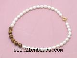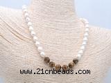 Details: Fashion pearl necklace: 16 - 24 inches 9mm - 10mm rice white freshwater pearls & yellow tiger eye beaded necklace finished with copper spring ring clasp Item: CFN426 Material: 9-10mm rice white freshwater pearls 10mm round yellow tiger eye beads 1.5*4mm copper spacers (No.2) 11mm copper spring ring clasp (you can choose different spacer & clasp, if you like sterling silver clasp, other clasp or better quality rice white freshwater pearls we don't show, please contact us before you placing order) Color: See image Style: No.1: Non-knotted (Default) No.2: Hand-knotted Length (inch): Approx 16 inch (16-17”, Default) You can choose 17”(17-18”); 18”(18-19”); 19”(19-20”); 20”(20-21”); 22”(22-23”) or 24”(24-25”) Quantity Discount Pricing: 1 – 4: None 5 – 49: 95% 50 – 99: 90% 100+: 85% The listed price is for 1 piece Style #1(Non-knotted) 16 inch necklace; The picture shows 17 inch necklace Custom orders are available upon request! The picture is for reference only, there will be tiny different in shape, color or quality for some products from different date code. we will send your orders randomly according to our stock