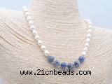 Details: Fashion pearl necklace: 16 - 24 inches 9mm - 10mm rice white freshwater pearls & 10mm round blue spot stone beaded necklace finished with copper spring ring clasp Item: CFN450 Material: 9-10mm rice white freshwater pearls 10mm round blue spot stone beads 1.5*4mm copper spacers (No.2) 11mm copper spring ring clasp (you can choose different spacer & clasp, if you like sterling silver clasp, other clasp or better quality rice white freshwater pearls we don't show, please contact us before you placing order) Color: See image Style: No.1: Non-knotted (Default) No.2: Hand-knotted Length (inch): Approx 16 inch (16-17”, Default) You can choose 17”(17-18”); 18”(18-19”); 19”(19-20”); 20”(20-21”); 22”(22-23”) or 24”(24-25”) Quantity Discount Pricing: 1 – 4: None 5 – 49: 95% 50 – 99: 90% 100+: 85% The listed price is for 1 piece Style #1(Non-knotted) 16 inch necklace; The picture shows 17 inch necklace Custom orders are available upon request! The picture is for reference only, there will be tiny different in shape, color or quality for some products from different date code. we will send your orders randomly according to our stock