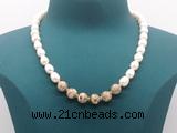 Details: Fashion pearl necklace: 16 - 24 inches 9mm - 10mm rice white freshwater pearls & 10mm round feldspar beaded necklace finished with copper spring ring clasp Item: CFN452 Material: 9-10mm rice white freshwater pearls 10mm round feldspar beads 1.5*4mm copper spacers (No.2) 11mm copper spring ring clasp (you can choose different spacer & clasp, if you like sterling silver clasp, other clasp or better quality rice white freshwater pearls we don't show, please contact us before you placing order) Color: See image Style: No.1: Non-knotted (Default) No.2: Hand-knotted Length (inch): Approx 16 inch (16-17”, Default) You can choose 17”(17-18”); 18”(18-19”); 19”(19-20”); 20”(20-21”); 22”(22-23”) or 24”(24-25”) Quantity Discount Pricing: 1 – 4: None 5 – 49: 95% 50 – 99: 90% 100+: 85% The listed price is for 1 piece Style #1(Non-knotted) 16 inch necklace; The picture shows 17 inch necklace Custom orders are available upon request! The picture is for reference only, there will be tiny different in shape, color or quality for some products from different date code. we will send your orders randomly according to our stock