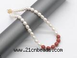 Details: Fashion pearl necklace: 16 - 24 inches 9mm - 10mm rice white freshwater pearls & 10mm round red jasper beaded necklace finished with copper spring ring clasp Item: CFN461 Material: 9-10mm rice white freshwater pearls 10mm round red jasper beads 1.5*4mm copper spacers (No.2) 11mm copper spring ring clasp (you can choose different spacer & clasp, if you like sterling silver clasp, other clasp or better quality rice white freshwater pearls we don't show, please contact us before you placing order) Color: See image Style: No.1: Non-knotted (Default) No.2: Hand-knotted Length (inch): Approx 16 inch (16-17”, Default) You can choose 17”(17-18”); 18”(18-19”); 19”(19-20”); 20”(20-21”); 22”(22-23”) or 24”(24-25”) Quantity Discount Pricing: 1 – 4: None 5 – 49: 95% 50 – 99: 90% 100+: 85% The listed price is for 1 piece Style #1(Non-knotted) 16 inch necklace; The picture shows 17 inch necklace Custom orders are available upon request! The picture is for reference only, there will be tiny different in shape, color or quality for some products from different date code. we will send your orders randomly according to our stock