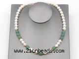 Details: Fashion pearl necklace: 9mm - 10mm potato white freshwater pearls & green aventurine beaded necklace finished with copper spring ring clasp Item: CFN504 Material: 9-10mm potato white freshwater pearls 10mm & 12mm round green aventurine beads 2*5mm copper spacers (No.4) 11mm copper spring ring clasp (you can choose different spacer & clasp, if you like sterling silver clasp, other clasp or better quality potato white freshwater pearls we don't show, please contact us before you placing order) Color: See image Style: No.1: Non-knotted (Default) No.2: Hand-knotted Length (inch): Approx 16 inch (16-17”, Default) You can choose 17”(17-18”); 18”(18-19”); 19”(19-20”); 20”(20-21”); 22”(22-23”) or 24”(24-25”) Quantity Discount Pricing: 1 - 4: None 5 - 49: 95% 50 - 99: 90% 100+: 85% The listed price is for 1 piece Style #1(Non-knotted) 16 inch necklace; The picture shows 19 inch necklace Custom orders are available upon request! The picture is for reference only, there will be tiny different in shape, color or quality for some products from different date code. we will send your orders randomly according to our stock