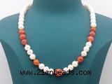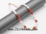 Details: Fashion pearl necklace: 9mm - 10mm potato white freshwater pearls & fire agate beaded necklace finished with copper spring ring clasp Item: CFN511 Material: 9-10mm potato white freshwater pearls 10mm & 12mm round fire agate beads 2*5mm copper spacers (No.4) 11mm copper spring ring clasp (you can choose different spacer & clasp, if you like sterling silver clasp, other clasp or better quality potato white freshwater pearls we don't show, please contact us before you placing order) Color: See image Style: No.1: Non-knotted (Default) No.2: Hand-knotted Length (inch): Approx 16 inch (16-17”, Default) You can choose 17”(17-18”); 18”(18-19”); 19”(19-20”); 20”(20-21”); 22”(22-23”) or 24”(24-25”) Quantity Discount Pricing: 1 - 4: None 5 - 49: 95% 50 - 99: 90% 100+: 85% The listed price is for 1 piece Style #1(Non-knotted) 16 inch necklace; The picture shows 19 inch necklace Custom orders are available upon request! The picture is for reference only, there will be tiny different in shape, color or quality for some products from different date code. we will send your orders randomly according to our stock