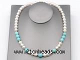 Details: Fashion pearl necklace: 16 - 24 inches 9mm - 10mm potato white freshwater pearls & blue howlite turquoise beaded necklace finished with copper spring ring clasp Item: CFN519 Material: 9-10mm potato white freshwater pearls 10mm & 12mm round blue howlite turquoise 2*5mm copper spacers (No.4) 11mm copper spring ring clasp (you can choose different spacer & clasp, if you like sterling silver clasp, other clasp or better quality potato white freshwater pearls we don't show, please contact us before you placing order) Color: See image Style: No.1: Non-knotted (Default) No.2: Hand-knotted Length (inch): Approx 16 inch (16-17”, Default) You can choose 17”(17-18”); 18”(18-19”); 19”(19-20”); 20”(20-21”); 22”(22-23”) or 24”(24-25”) Quantity Discount Pricing: 1 - 4: None 5 - 49: 95% 50 - 99: 90% 100+: 85% The listed price is for 1 piece Style #1(Non-knotted) 16 inch necklace; The picture shows 19 inch necklace Custom orders are available upon request! The picture is for reference only, there will be tiny different in shape, color or quality for some products from different date code. we will send your orders randomly according to our stock