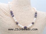 Details: Fashion pearl necklace: 16 - 24 inches 9mm - 10mm potato white freshwater pearls & dogtooth amethyst beaded necklace finished with copper spring ring clasp Item: CFN533 Material: 9-10mm potato white freshwater pearls 10mm & 12mm round dogtooth amethyst beads 2*5mm copper spacers (No.4) 11mm copper spring ring clasp (you can choose different spacer & clasp, if you like sterling silver clasp, other clasp or better quality potato white freshwater pearls we don't show, please contact us before you placing order) Color: See image Style: No.1: Non-knotted (Default) No.2: Hand-knotted Length (inch): Approx 16 inch (16-17”, Default) You can choose 17”(17-18”); 18”(18-19”); 19”(19-20”); 20”(20-21”); 22”(22-23”) or 24”(24-25”) Quantity Discount Pricing: 1 - 4: None 5 - 49: 95% 50 - 99: 90% 100+: 85% The listed price is for 1 piece Style #1(Non-knotted) 16 inch necklace; The picture shows 19 inch necklace Custom orders are available upon request! The picture is for reference only, there will be tiny different in shape, color or quality for some products from different date code. we will send your orders randomly according to our stock