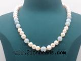 Details: Fashion pearl necklace: 16 - 24 inches 9mm - 10mm potato white freshwater pearls & aquamarine beaded necklace finished with copper spring ring clasp Item: CFN535 Material: 9-10mm potato white freshwater pearls 10mm & 12mm round aquamarine beads 2*5mm copper spacers (No.4) 11mm copper spring ring clasp (you can choose different spacer & clasp, if you like sterling silver clasp, other clasp or better quality potato white freshwater pearls we don't show, please contact us before you placing order) Color: See image Style: No.1: Non-knotted (Default) No.2: Hand-knotted Length (inch): Approx 16 inch (16-17”, Default) You can choose 17”(17-18”); 18”(18-19”); 19”(19-20”); 20”(20-21”); 22”(22-23”) or 24”(24-25”) Quantity Discount Pricing: 1 - 4: None 5 - 49: 95% 50 - 99: 90% 100+: 85% The listed price is for 1 piece Style #1(Non-knotted) 16 inch necklace; The picture shows 19 inch necklace Custom orders are available upon request! The picture is for reference only, there will be tiny different in shape, color or quality for some products from different date code. we will send your orders randomly according to our stock