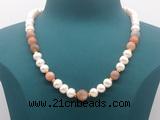 Details: Fashion pearl necklace: 16 - 24 inches 9mm - 10mm potato white freshwater pearls & rainbow moonstone beaded necklace finished with copper spring ring clasp Item: CFN537 Material: 9-10mm potato white freshwater pearls 10mm & 12mm round rainbow moonstone beads 2*5mm copper spacers (No.4) 11mm copper spring ring clasp (you can choose different spacer & clasp, if you like sterling silver clasp, other clasp or better quality potato white freshwater pearls we don't show, please contact us before you placing order) Color: See image Style: No.1: Non-knotted (Default) No.2: Hand-knotted Length (inch): Approx 16 inch (16-17”, Default) You can choose 17”(17-18”); 18”(18-19”); 19”(19-20”); 20”(20-21”); 22”(22-23”) or 24”(24-25”) Quantity Discount Pricing: 1 - 4: None 5 - 49: 95% 50 - 99: 90% 100+: 85% The listed price is for 1 piece Style #1(Non-knotted) 16 inch necklace; The picture shows 19 inch necklace Custom orders are available upon request! The picture is for reference only, there will be tiny different in shape, color or quality for some products from different date code. we will send your orders randomly according to our stock