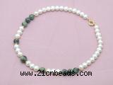 Details: Fashion pearl necklace: 16 - 24 inches 9mm - 10mm potato white freshwater pearls & African turquoise beaded necklace finished with copper spring ring clasp Item: CFN549 Material: 9-10mm potato white freshwater pearls 10mm & 12mm round African turquoise beads 2*5mm copper spacers (No.4) 11mm copper spring ring clasp (you can choose different spacer & clasp, if you like sterling silver clasp, other clasp or better quality potato white freshwater pearls we don't show, please contact us before you placing order) Color: See image Style: No.1: Non-knotted (Default) No.2: Hand-knotted Length (inch): Approx 16 inch (16-17”, Default) You can choose 17”(17-18”); 18”(18-19”); 19”(19-20”); 20”(20-21”); 22”(22-23”) or 24”(24-25”) Quantity Discount Pricing: 1 - 4: None 5 - 49: 95% 50 - 99: 90% 100+: 85% The listed price is for 1 piece Style #1(Non-knotted) 16 inch necklace; The picture shows 19 inch necklace Custom orders are available upon request! The picture is for reference only, there will be tiny different in shape, color or quality for some products from different date code. we will send your orders randomly according to our stock
