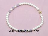 Details: Fashion pearl necklace: 16 - 24 inches 9mm - 10mm potato white freshwater pearls & lavender amethyst beaded necklace finished with copper spring ring clasp Item: CFN703 Material: 9-10mm potato white freshwater pearls 10mm round lavender amethyst beads 2*5mm copper spacers (No.4) 11mm copper spring ring clasp (you can choose different spacer & clasp, if you like sterling silver clasp, other clasp or better quality potato white freshwater pearls we don't show, please contact us before you placing order) Color: See image Style: No.1: Non-knotted (Default) No.2: Hand-knotted Length (inch): Approx 16 inch (16-17”, Default) You can choose 17”(17-18”); 18”(18-19”); 19”(19-20”); 20”(20-21”); 22”(22-23”) or 24”(24-25”) Quantity Discount Pricing: 1 - 4: None 5 - 49: 95% 50 - 99: 90% 100+: 85% The listed price is for 1 piece Style #1(Non-knotted) 16 inch necklace; The picture shows 17.5 inch necklace Custom orders are available upon request! The picture is for reference only, there will be tiny different in shape, color or quality for some products from different date code. we will send your orders randomly according to our stock