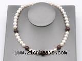 Details: Fashion pearl necklace: 16 - 24 inches 9mm - 10mm potato white freshwater pearls & brecciated jasper beaded necklace finished with copper spring ring clasp Item: CFN756 Material: 9-10mm potato white freshwater pearls 10/12mmmm round brecciated jasper beads 2*5mm copper spacers (No.4) 11mm copper spring ring clasp (you can choose different spacer & clasp, if you like sterling silver clasp, other clasp or better quality potato white freshwater pearls we don't show, please contact us before you placing order) Color: See image Style: No.1: Non-knotted (Default) No.2: Hand-knotted Length (inch): Approx 16 inch (16-17”, Default) You can choose 17”(17-18”); 18”(18-19”); 19”(19-20”); 20”(20-21”); 22”(22-23”) or 24”(24-25”) Quantity Discount Pricing: 1 - 4: None 5 - 49: 95% 50 - 99: 90% 100+: 85% The listed price is for 1 piece 16 inch Non-knotted & Color/Number #1 necklace; The picture shows 17.5 inch Non-knotted & Color/Number #4 necklace Custom orders are available upon request! The picture is for reference only, there will be tiny different in shape, color or quality for some products from different date code. we will send your orders randomly according to our stock