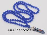 Details: Hand-knotted candy jade mala necklaces: 108 8mm round candy jade beads with 1 12mm guru bead and lapis lazuli pendant (you can choose different pendants) Item: GMN1407 Material: Candy jade & lapis lazuli pendant Color: See image Length (inch): Necklace length: approx 37 - 40 inches(Not including guru bead & pendant) Pendants: #1 - #8: approx 20*50mm – 22*55mm #9 - #23: approx 16*50mm – 16*55mm #24 - #30: approx 17*55mm – 17*58mm #31 - #39: approx 25*68mm – 25*70mm Quantity Discount Pricing: 1 – 4: None 5 – 49: 95% 50 – 99: 90% 100+: 85% The listed price is for 1 piece necklace Each necklaces is handmade and hand-knotted with different gemstones. Please be aware that each necklace varies in stone pattern and color - Making it a truly one-of-a-kind, unique piece of jewelry. Custom orders are available upon request! If you see different stones you like/want incorporated into a mala necklace or you have any need, please contact us before you placing order or leave remark, and we will be happy to create a mala just for you! Mala necklace is worn on the neck or wrist while not in use. It may also serve as a nice accessory in everyday life or on some special occasions. Whether as a calming meditation guide or a beautiful, this necklace will be a great addition to your spiritual practice.