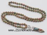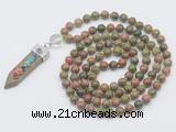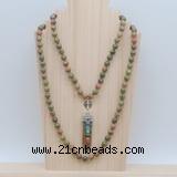 Details: Hand-knotted unakite mala necklaces: 108 8mm/10mm round unakite beads with 1 12mm white crystal guru bead and unakite pendant (you can choose different pendants) Item: GMN1471 Material: No.1(8mm: 108 8mm unakite beads, 12mm white crystal guru bead & unakite pendant No.2(10mm: 108 10mm unakite beads, 12mm white crystal guru bead & unakite pendant Color: See image Length (inch): Necklace length: No.1(8mm: approx 37 - 40 inches (Not including guru bead & pendant) No.2(10mm: approx 46 - 50 inches (Not including guru bead & pendant) Pendants: #1 - #8: approx 20*50mm – 22*55mm #9 - #23: approx 16*50mm – 16*55mm #24 - #30: approx 17*55mm – 17*58mm #31 - #39: approx 25*68mm – 25*70mm Quantity Discount Pricing: 1 – 4: None 5 – 49: 95% 50 – 99: 90% 100+: 85% This mala is available in both 8mm and 10mm beads, The listed price is for 1 piece 8mm mala necklace Each necklaces is handmade and hand-knotted with different gemstones. Please be aware that each necklace varies in stone pattern and color - Making it a truly one-of-a-kind, unique piece of jewelry. Custom orders are available upon request! If you see different stones you like/want incorporated into a mala necklace or you have any need, please contact us before you placing order or leave remark, and we will be happy to create a mala just for you! Mala necklace is worn on the neck or wrist while not in use. It may also serve as a nice accessory in everyday life or on some special occasions. Whether as a calming meditation guide or a beautiful, this necklace will be a great addition to your spiritual practice.