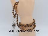 Details: Hand-knotted tiger eye mala necklaces: 108 8mm/10mm round grade AA yellow tiger eye beads with 1 12mm guru bead and tiger eye & white crystal pendant (you can choose different pendants) Item: GMN1488 Material: No.1(8mm: 108 8mm yellow tiger eye beads, 12mm guru bead & white crystal pendant No.2(10mm: 108 10mm yellow tiger eye beads, 12mm guru bead & white crystal pendant Color: See image Length (inch): Necklace length: No.1(8mm: approx 37 - 40 inches (Not including guru bead & pendant) No.2(10mm: approx 46 - 50 inches (Not including guru bead & pendant) Pendants: #1 - #8: approx 20*50mm – 22*55mm #9 - #23: approx 16*50mm – 16*55mm #24 - #30: approx 17*55mm – 17*58mm #31 - #39: approx 25*68mm – 25*70mm Quantity Discount Pricing: 1 – 4: None 5 – 49: 95% 50 – 99: 90% 100+: 85% This mala is available in both 8mm and 10mm beads, The listed price is for 1 piece 8mm mala necklace Each necklaces is handmade and hand-knotted with different gemstones. Please be aware that each necklace varies in stone pattern and color - Making it a truly one-of-a-kind, unique piece of jewelry. Custom orders are available upon request! If you see different stones you like/want incorporated into a mala necklace or you have any need, please contact us before you placing order or leave remark, and we will be happy to create a mala just for you! Mala necklace is worn on the neck or wrist while not in use. It may also serve as a nice accessory in everyday life or on some special occasions. Whether as a calming meditation guide or a beautiful, this necklace will be a great addition to your spiritual practice.