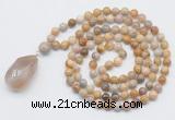 Details: Hand-knotted agate mala necklaces: 108 8mm/10mm round bamboo leaf agate beads with 1 12mm guru bead and labradorite pendant (you can choose different pendants) Item: GMN1522 Material: No.1(8mm: 108 8mm bamboo leaf agate beads, 12mm guru bead & labradorite pendant No.2(10mm: 108 10mm bamboo leaf agate beads, 12mm guru bead & labradorite pendant Color: See image Length (inch): Necklace length: No.1(8mm: approx 37 - 40 inches (Not including guru bead & pendant) No.2(10mm: approx 46 - 50 inches (Not including guru bead & pendant) Pendants: #1 - #8: approx 20*50mm – 22*55mm #9 - #23: approx 16*50mm – 16*55mm #24 - #30: approx 17*55mm – 17*58mm #31 - #39: approx 25*68mm – 25*70mm Quantity Discount Pricing: 1 – 4: None 5 – 49: 95% 50 – 99: 90% 100+: 85% This mala is available in both 8mm and 10mm beads, The listed price is for 1 piece 8mm mala necklace Each necklaces is handmade and hand-knotted with different gemstones. Please be aware that each necklace varies in stone pattern and color - Making it a truly one-of-a-kind, unique piece of jewelry. Custom orders are available upon request! If you see different stones you like/want incorporated into a mala necklace or you have any need, please contact us before you placing order or leave remark, and we will be happy to create a mala just for you! Mala necklace is worn on the neck or wrist while not in use. It may also serve as a nice accessory in everyday life or on some special occasions. Whether as a calming meditation guide or a beautiful, this necklace will be a great addition to your spiritual practice.