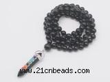 Details: Hand-knotted obsidian mala necklaces: 108 8mm/10mm round black obsidian gemstone beads with 1 12mm guru bead and obsidian pendant (you can choose different pendants) Item: GMN1561 Material: No.1(8mm: 108 8mm black obsidian beads, 12mm guru bead & obsidian pendant No.2(10mm: 108 10mm black obsidian beads, 12mm guru bead & obsidian pendant Color: See image Length (inch): Necklace length: No.1(8mm: approx 37 - 40 inches (Not including guru bead & pendant) No.2(10mm: approx 46 - 50 inches (Not including guru bead & pendant) Pendants: #1 - #8: approx 20*50mm – 22*55mm #9 - #23: approx 16*50mm – 16*55mm #24 - #30: approx 17*55mm – 17*58mm #31 - #39: approx 25*68mm – 25*70mm Quantity Discount Pricing: 1 – 4: None 5 – 49: 95% 50 – 99: 90% 100+: 85% This mala is available in both 8mm and 10mm beads, The listed price is for 1 piece 8mm mala necklace Each necklaces is handmade and hand-knotted with different gemstones. Please be aware that each necklace varies in stone pattern and color - Making it a truly one-of-a-kind, unique piece of jewelry. Custom orders are available upon request! If you see different stones you like/want incorporated into a mala necklace or you have any need, please contact us before you placing order or leave remark, and we will be happy to create a mala just for you! Mala necklace is worn on the neck or wrist while not in use. It may also serve as a nice accessory in everyday life or on some special occasions. Whether as a calming meditation guide or a beautiful, this necklace will be a great addition to your spiritual practice.