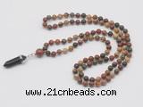 Details: Hand-knotted jasper mala necklaces: 108 6mm round picasso jasper beads with 1 10mm guru bead and obsidian pendant (you can choose different pendants) Item: GMN1612 Material: picasso jasper & obsidian pendant Color: See image Length (inch): Necklace length: approx 28 - 31 inches(Not including guru bead & pendant) Pendants: approx 12*38mm - 12*40mm Quantity Discount Pricing: 1 – 4: None 5 – 49: 95% 50 – 99: 90% 100+: 85% The listed price is for 1 piece necklace Each necklaces is handmade and hand-knotted with different gemstones. Please be aware that each necklace varies in stone pattern and color - Making it a truly one-of-a-kind, unique piece of jewelry. Custom orders are available upon request! If you see different stones you like/want incorporated into a mala necklace or you have any need, please contact us before you placing order or leave remark, and we will be happy to create a mala just for you! Mala necklace is worn on the neck or wrist while not in use. It may also serve as a nice accessory in everyday life or on some special occasions. Whether as a calming meditation guide or a beautiful, this necklace will be a great addition to your spiritual practice.