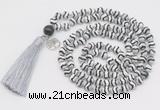 Details: Hand-knotted jasper mala necklaces: 108 8mm/10mm round red jasper beads with 1 12mm guru bead and satin tassel & alloy charm (you can choose different tassels & charms) Item: GMN1769 Material: No.1(8mm: 108 8mm red jasper, 12mm guru bead, satin tassel & charm No.2(10mm: 108 10mm red jasper, 12mm guru bead, satin tassel & charm Color: See image Length (inch): Necklace length: No.1(8mm: approx 37 - 40 inches (Not including guru bead & charm) No.2(10mm: approx 46 - 50 inches (Not including guru bead & charm) Quantity Discount Pricing: 1 – 4: None 5 – 49: 95% 50 – 99: 90% 100+: 85% This mala is available in both 8mm and 10mm beads, The listed price is for 1 piece 8mm mala necklace Each necklaces is handmade and hand-knotted with different gemstones. Please be aware that each necklace varies in stone pattern and color - Making it a truly one-of-a-kind, unique piece of jewelry. Custom orders are available upon request! If you see different stones you like/want incorporated into a mala necklace or you have any need, please contact us before you placing order or leave remark, and we will be happy to create a mala just for you! Mala necklace is worn on the neck or wrist while not in use. It may also serve as a nice accessory in everyday life or on some special occasions. Whether as a calming meditation guide or a beautiful, this necklace will be a great addition to your spiritual practice.