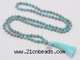 Details: Hand-knotted jasper mala necklaces: 108 8mm/10mm round sea sediment jasper beads with 1 12mm guru bead and satin tassel & alloy charm (you can choose different tassels & charms) Item: GMN1782 Material: No.1(8mm: 108 8mm sea sediment jasper, 12mm guru bead, satin tassel & charm No.2(10mm: 108 10mm sea sediment jasper, 12mm guru bead, satin tassel & charm Color: See image Length (inch): Necklace length: No.1(8mm: approx 37 - 40 inches (Not including guru bead & charm) No.2(10mm: approx 46 - 50 inches (Not including guru bead & charm) Quantity Discount Pricing: 1 – 4: None 5 – 49: 95% 50 – 99: 90% 100+: 85% This mala is available in both 8mm and 10mm beads, The listed price is for 1 piece 8mm mala necklace Each necklaces is handmade and hand-knotted with different gemstones. Please be aware that each necklace varies in stone pattern and color - Making it a truly one-of-a-kind, unique piece of jewelry. Custom orders are available upon request! If you see different stones you like/want incorporated into a mala necklace or you have any need, please contact us before you placing order or leave remark, and we will be happy to create a mala just for you! Mala necklace is worn on the neck or wrist while not in use. It may also serve as a nice accessory in everyday life or on some special occasions. Whether as a calming meditation guide or a beautiful, this necklace will be a great addition to your spiritual practice.