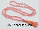 Details: Hand-knotted quartz mala necklaces: 108 8mm/10mm round cherry quartz beads with 1 12mm guru bead and satin tassel & alloy charm (you can choose different tassels & charms) Item: GMN1814 Material: No.1(8mm: 108 8mm cherry quartz, 12mm guru bead, satin tassel & charm No.2(10mm: 108 10mm cherry quartz, 12mm guru bead, satin tassel & charm Color: See image Length (inch): Necklace length: No.1(8mm: approx 37 - 40 inches (Not including guru bead & charm) No.2(10mm: approx 46 - 50 inches (Not including guru bead & charm) Quantity Discount Pricing: 1 – 4: None 5 – 49: 95% 50 – 99: 90% 100+: 85% This mala is available in both 8mm and 10mm beads, The listed price is for 1 piece 8mm mala necklace Each necklaces is handmade and hand-knotted with different gemstones. Please be aware that each necklace varies in stone pattern and color - Making it a truly one-of-a-kind, unique piece of jewelry. Custom orders are available upon request! If you see different stones you like/want incorporated into a mala necklace or you have any need, please contact us before you placing order or leave remark, and we will be happy to create a mala just for you! Mala necklace is worn on the neck or wrist while not in use. It may also serve as a nice accessory in everyday life or on some special occasions. Whether as a calming meditation guide or a beautiful, this necklace will be a great addition to your spiritual practice.