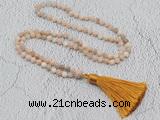 Details: Hand-knotted moonstone mala necklaces: 6mm round moonstone beads with 1 10mm guru bead and satin tassel (you can choose different colors) Item: GMN216 Material: Moonstone & Satin tassel Color: See image Length (inch): Necklace length: approx 28 - 31 inches (Not including guru bead & tassel) Tassel Lenght: 7cm Quantity Discount Pricing: 1 – 4: None 5 – 49: 95% 50 – 99: 90% 100+: 85% The listed price is for 1 piece mala necklace Each necklaces is handmade and hand-knotted with different gemstones. Please be aware that each necklace varies in stone pattern and color - Making it a truly one-of-a-kind, unique piece of jewelry. Custom orders are available upon request! If you see different stones you like/want incorporated into a mala necklace or you have any need, please contact us before you placing order or leave remark, and we will be happy to create a mala just for you! Mala necklace is worn on the neck or wrist while not in use. It may also serve as a nice accessory in everyday life or on some special occasions. Whether as a calming meditation guide or a beautiful, this necklace will be a great addition to your spiritual practice