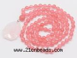 Details: Hand-knotted quartz mala necklaces: 108 8mm/10mm round cherry quartz beads with rose quartz pendant/12mm guru bead and rose quartz pendant (you can choose different pendants, but there will be tiny different in shape & color, we will make the jewelry randomly according to our stock) Item: GMN4600 Material: No.1: 8mm: 108 8mm cherry quartz beads & rose quartz pendant 10mm: 108 10mm cherry quartz beads & rose quartz pendant No.2: 8mm: 108 8mm cherry quartz beads, 12mm guru bead & rose quartz pendant 10mm: 108 10mm cherry quartz beads, 12mm guru bead & rose quartz pendant Color: See image Length (inch): Necklace length: 8mm: approx 37 - 40 inches (Not including guru bead & pendant) 10mm: approx 46 - 50 inches (Not including guru bead & pendant) Pendants: approx 18*50mm – 25*60mm Quantity Discount Pricing: 1 – 4: None 5 – 49: 95% 50 – 99: 90% 100+: 85% This mala is available in both 8mm and 10mm beads, The listed price is for 1 piece 8mm mala necklace Each necklaces is handmade and hand-knotted with different gemstones. Please be aware that each necklace varies in stone pattern and color - Making it a truly one-of-a-kind, unique piece of jewelry. Custom orders are available upon request! If you see different stones you like/want incorporated into a mala necklace or you have any need, please contact us before you placing order or leave remark, and we will be happy to create a mala just for you! Mala necklace is worn on the neck or wrist while not in use. It may also serve as a nice accessory in everyday life or on some special occasions. Whether as a calming meditation guide or a beautiful, this necklace will be a great addition to your spiritual practice.