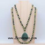 Details: Hand-knotted jade mala necklaces: 108 8mm/10mm round Canadian jade beads with green aventurine pendant/12mm guru bead and green aventurine pendant (you can choose different pendants, but there will be tiny different in shape & color, we will make the jewelry randomly according to our stock) Item: GMN4618 Material: No.1: 8mm: 108 8mm Canadian jade beads & green aventurine pendant 10mm: 108 10mm Canadian jade beads & green aventurine pendant No.2: 8mm: 108 8mm Canadian jade beads, 12mm guru bead & green aventurine pendant 10mm: 108 10mm Canadian jade beads, 12mm guru bead & green aventurine pendant Color: See image Length (inch): Necklace length: 8mm: approx 37 - 40 inches (Not including guru bead & pendant) 10mm: approx 46 - 50 inches (Not including guru bead & pendant) Pendants: approx 18*50mm – 25*60mm Quantity Discount Pricing: 1 – 4: None 5 – 49: 95% 50 – 99: 90% 100+: 85% This mala is available in both 8mm and 10mm beads, The listed price is for 1 piece 8mm mala necklace Each necklaces is handmade and hand-knotted with different gemstones. Please be aware that each necklace varies in stone pattern and color - Making it a truly one-of-a-kind, unique piece of jewelry. Custom orders are available upon request! If you see different stones you like/want incorporated into a mala necklace or you have any need, please contact us before you placing order or leave remark, and we will be happy to create a mala just for you! Mala necklace is worn on the neck or wrist while not in use. It may also serve as a nice accessory in everyday life or on some special occasions. Whether as a calming meditation guide or a beautiful, this necklace will be a great addition to your spiritual practice.