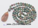Details: Hand-knotted agate mala necklaces: 108 8mm/10mm round Indian agate beads with agate pendant/12mm guru bead and agate pendant (you can choose different pendants, but there will be tiny different in shape & color, we will make the jewelry randomly according to our stock) Item: GMN4670 Material: No.1: 8mm: 108 8mm Indian agate beads & agate pendant 10mm: 108 10mm Indian agate beads & agate pendant No.2: 8mm: 108 8mm Indian agate beads, 12mm guru bead & agate pendant 10mm: 108 10mm Indian agate beads, 12mm guru bead & agate pendant Color: See image Length (inch): Necklace length: 8mm: approx 37 - 40 inches (Not including pendant) 10mm: approx 46 - 50 inches (Not including pendant) Quantity Discount Pricing: 1 – 4: None 5 – 49: 95% 50 – 99: 90% 100+: 85% This mala is available in both 8mm and 10mm beads, The listed price is for 1 piece 8mm mala necklace Each necklaces is handmade and hand-knotted with different gemstones. Please be aware that each necklace varies in stone pattern and color - Making it a truly one-of-a-kind, unique piece of jewelry. Custom orders are available upon request! If you see different stones you like/want incorporated into a mala necklace or you have any need, please contact us before you placing order or leave remark, and we will be happy to create a mala just for you! Mala necklace is worn on the neck or wrist while not in use. It may also serve as a nice accessory in everyday life or on some special occasions. Whether as a calming meditation guide or a beautiful, this necklace will be a great addition to your spiritual practice.