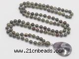 Details: Hand-knotted jasper mala necklaces: 108 8mm/10mm round dragon blood jasper beads with amethyst pendant/12mm guru bead and amethyst jasper pendant (you can choose different pendants, but there will be tiny different in shape & color, we will make the jewelry randomly according to our stock) Item: GMN4679 Material: No.1: 8mm: 108 8mm dragon blood jasper beads & amethyst pendant 10mm: 108 10mm dragon blood jasper beads & amethyst pendant No.2: 8mm: 108 8mm dragon blood jasper beads, 12mm guru bead & amethyst pendant 10mm: 108 10mm dragon blood jasper beads, 12mm guru bead & amethyst pendant Color: See image Length (inch): Necklace length: 8mm: approx 37 - 40 inches (Not including guru bead & pendant) 10mm: approx 46 - 50 inches (Not including guru bead & pendant) Quantity Discount Pricing: 1 – 4: None 5 – 49: 95% 50 – 99: 90% 100+: 85% This mala is available in both 8mm and 10mm beads, The listed price is for 1 piece 8mm mala necklace Each necklaces is handmade and hand-knotted with different gemstones. Please be aware that each necklace varies in stone pattern and color - Making it a truly one-of-a-kind, unique piece of jewelry. Custom orders are available upon request! If you see different stones you like/want incorporated into a mala necklace or you have any need, please contact us before you placing order or leave remark, and we will be happy to create a mala just for you! Mala necklace is worn on the neck or wrist while not in use. It may also serve as a nice accessory in everyday life or on some special occasions. Whether as a calming meditation guide or a beautiful, this necklace will be a great addition to your spiritual practice.