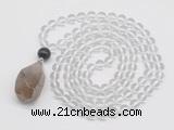 Details: Hand-knotted quartz mala necklaces: 108 8mm/10mm round white crystal beads with 1 12mm black agate guru bead and smoky quartz pendant (you can choose different pendants, but there will be tiny different in shape & color, we will make the jewelry randomly according to our stock) Item: GMN4801 Material: 8mm: 108 8mm white crystal beads, 12mm black agate guru bead & smoky quartz pendant 10mm: 108 10mm white crystal beads, 12mm black agate guru bead & smoky quartz pendant Color: See image Length (inch): Necklace length: 8mm: approx 37 - 40 inches (Not including guru bead & pendant) 10mm: approx 46 - 50 inches (Not including guru bead & pendant) Pendants: approx 18*35mm – 28*40mm Quantity Discount Pricing: 1 – 4: None 5 – 49: 95% 50 – 99: 90% 100+: 85% This mala is available in both 8mm and 10mm beads, The listed price is for 1 piece 8mm mala necklace Each necklaces is handmade and hand-knotted with different gemstones. Please be aware that each necklace varies in stone pattern and color - Making it a truly one-of-a-kind, unique piece of jewelry. Custom orders are available upon request! If you see different stones you like/want incorporated into a mala necklace or you have any need, please contact us before you placing order or leave remark, and we will be happy to create a mala just for you! Mala necklace is worn on the neck or wrist while not in use. It may also serve as a nice accessory in everyday life or on some special occasions. Whether as a calming meditation guide or a beautiful, this necklace will be a great addition to your spiritual practice.