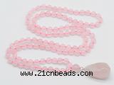 Details: Hand-knotted quartz mala necklaces: 108 8mm/10mm round rose quartz beads with 1 12mm guru bead and rose quartz pendant (you can choose different pendants, but there will be tiny different in shape & color, we will make the jewelry randomly according to our stock) Item: GMN4809 Material: 8mm: 108 8mm rose quartz beads, 12mm guru bead & rose quartz pendant 10mm: 108 10mm rose quartz beads, 12mm guru bead & rose quartz pendant Color: See image Length (inch): Necklace length: 8mm: approx 37 - 40 inches (Not including guru bead & pendant) 10mm: approx 46 - 50 inches (Not including guru bead & pendant) Pendants: approx 18*35mm – 28*40mm Quantity Discount Pricing: 1 – 4: None 5 – 49: 95% 50 – 99: 90% 100+: 85% This mala is available in both 8mm and 10mm beads, The listed price is for 1 piece 8mm mala necklace Each necklaces is handmade and hand-knotted with different gemstones. Please be aware that each necklace varies in stone pattern and color - Making it a truly one-of-a-kind, unique piece of jewelry. Custom orders are available upon request! If you see different stones you like/want incorporated into a mala necklace or you have any need, please contact us before you placing order or leave remark, and we will be happy to create a mala just for you! Mala necklace is worn on the neck or wrist while not in use. It may also serve as a nice accessory in everyday life or on some special occasions. Whether as a calming meditation guide or a beautiful, this necklace will be a great addition to your spiritual practice.