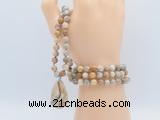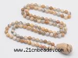 Details: Hand-knotted agate mala necklaces: 108 8mm/10mm round yellow crazy lace agate beads with picture jasper pendant (you can choose different pendants, but there will be tiny different in shape & color, we will make the jewelry randomly according to our stock) Item: GMN4830 Material: 8mm: 108 8mm yellow crazy lace agate beads & picture jasper pendant 10mm: 108 10mm yellow crazy lace agate beads & picture jasper pendant Color: See image Length (inch): Necklace length: 8mm: approx 37 - 40 inches (Not including pendant) 10mm: approx 46 - 50 inches (Not including pendant) Pendants: approx 18*35mm – 28*40mm Quantity Discount Pricing: 1 – 4: None 5 – 49: 95% 50 – 99: 90% 100+: 85% This mala is available in both 8mm and 10mm beads, The listed price is for 1 piece 8mm mala necklace Each necklaces is handmade and hand-knotted with different gemstones. Please be aware that each necklace varies in stone pattern and color - Making it a truly one-of-a-kind, unique piece of jewelry. Custom orders are available upon request! If you see different stones you like/want incorporated into a mala necklace or you have any need, please contact us before you placing order or leave remark, and we will be happy to create a mala just for you! Mala necklace is worn on the neck or wrist while not in use. It may also serve as a nice accessory in everyday life or on some special occasions. Whether as a calming meditation guide or a beautiful, this necklace will be a great addition to your spiritual practice.