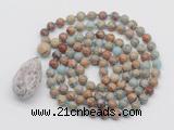 Details: Hand-knotted jasper mala necklaces: 108 8mm/10mm round serpentine jasper beads with 1 12mm guru bead and tourmaline pendant (you can choose different pendants, but there will be tiny different in shape & color, we will make the jewelry randomly according to our stock) Item: GMN4871 Material: 8mm: 108 8mm serpentine jasper beads, 12mm guru bead & tourmaline pendant 10mm: 108 10mm serpentine jasper beads, 12mm guru bead & tourmaline pendant Color: See image Length (inch): Necklace length: 8mm: approx 37 - 40 inches (Not including guru bead & pendant) 10mm: approx 46 - 50 inches (Not including guru bead & pendant) Pendants: approx 18*35mm – 28*40mm Quantity Discount Pricing: 1 – 4: None 5 – 49: 95% 50 – 99: 90% 100+: 85% This mala is available in both 8mm and 10mm beads, The listed price is for 1 piece 8mm mala necklace Each necklaces is handmade and hand-knotted with different gemstones. Please be aware that each necklace varies in stone pattern and color - Making it a truly one-of-a-kind, unique piece of jewelry. Custom orders are available upon request! If you see different stones you like/want incorporated into a mala necklace or you have any need, please contact us before you placing order or leave remark, and we will be happy to create a mala just for you! Mala necklace is worn on the neck or wrist while not in use. It may also serve as a nice accessory in everyday life or on some special occasions. Whether as a calming meditation guide or a beautiful, this necklace will be a great addition to your spiritual practice.
