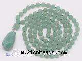 Details: Hand-knotted aventurine mala necklaces: 108 8mm/10mm round matte green aventurine beads with green aventurine pendant/12mm guru bead and green aventurine pendant (you can choose different pendants, but there will be tiny different in shape & color, we will make the jewelry randomly according to our stock) Item: GMN5006 Material: No.1: 8mm: 108 8mm matte green aventurine beads & green aventurine pendant 10mm: 108 10mm matte green aventurine beads & green aventurine pendant No.2: 8mm: 108 8mm matte green aventurine beads, 12mm guru bead & green aventurine pendant 10mm: 108 10mm matte green aventurine beads, 12mm guru bead & green aventurine pendant Color: See image Length (inch): Necklace length: 8mm: approx 37 - 40 inches (Not including guru bead & pendant) 10mm: approx 46 - 50 inches (Not including guru bead & pendant) Pendants: approx 18*35mm - 28*40mm Quantity Discount Pricing: 1 – 4: None 5 – 49: 95% 50 – 99: 90% 100+: 85% This mala is available in both 8mm and 10mm beads, The listed price is for 1 piece 8mm mala necklace Each necklaces is handmade and hand-knotted with different gemstones. Please be aware that each necklace varies in stone pattern and color - Making it a truly one-of-a-kind, unique piece of jewelry. Custom orders are available upon request! If you see different stones you like/want incorporated into a mala necklace or you have any need, please contact us before you placing order or leave remark, and we will be happy to create a mala just for you! Mala necklace is worn on the neck or wrist while not in use. It may also serve as a nice accessory in everyday life or on some special occasions. Whether as a calming meditation guide or a beautiful, this necklace will be a great addition to your spiritual practice.
