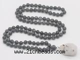 Details: Hand-knotted labradorite mala necklaces: 108 8mm/10mm round matte black labradorite beads with black rutilated quartz pendant/12mm guru bead and black rutilated quartz pendant (you can choose different pendants, but there will be tiny different in shape & color, we will make the jewelry randomly according to our stock) Item: GMN5023 Material: No.1: 8mm: 108 8mm matte black labradorite beads & black rutilated quartz pendant 10mm: 108 10mm matte black labradorite beads & black rutilated quartz pendant No.2: 8mm: 108 8mm matte black labradorite beads, 12mm guru bead & black rutilated quartz pendant 10mm: 108 10mm matte black labradorite beads, 12mm guru bead & black rutilated quartz pendant Color: See image Length (inch): Necklace length: 8mm: approx 37 - 40 inches (Not including guru bead & pendant) 10mm: approx 46 - 50 inches (Not including guru bead & pendant) Pendants: approx 18*35mm - 28*40mm Quantity Discount Pricing: 1 – 4: None 5 – 49: 95% 50 – 99: 90% 100+: 85% This mala is available in both 8mm and 10mm beads, The listed price is for 1 piece 8mm mala necklace Each necklaces is handmade and hand-knotted with different gemstones. Please be aware that each necklace varies in stone pattern and color - Making it a truly one-of-a-kind, unique piece of jewelry. Custom orders are available upon request! If you see different stones you like/want incorporated into a mala necklace or you have any need, please contact us before you placing order or leave remark, and we will be happy to create a mala just for you! Mala necklace is worn on the neck or wrist while not in use. It may also serve as a nice accessory in everyday life or on some special occasions. Whether as a calming meditation guide or a beautiful, this necklace will be a great addition to your spiritual practice.