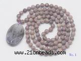 Details: Hand-knotted lepidolite mala necklaces: 108 8mm/10mm round lepidolite beads with amethyst pendant/12mm guru bead and amethyst pendant (you can choose different pendants, but there will be tiny different in shape & color, we will make the jewelry randomly according to our stock) Item: GMN5059 Material: No.1: 8mm: 108 8mm lepidolite beads & amethyst pendant 10mm: 108 10mm lepidolite beads & amethyst pendant No.2: 8mm: 108 8mm lepidolite beads, 12mm guru bead & amethyst pendant 10mm: 108 10mm lepidolite beads, 12mm guru bead & amethyst pendant Color: See image Length (inch): Necklace length: 8mm: approx 37 - 40 inches (Not including guru bead & pendant) 10mm: approx 46 - 50 inches (Not including guru bead & pendant) Quantity Discount Pricing: 1 - 4: None 5 - 49: 95% 50 - 99: 90% 100+: 85% This mala is available in both 8mm and 10mm beads, The listed price is for 1 piece 8mm mala necklace Each necklaces is handmade and hand-knotted with different gemstones. Please be aware that each necklace varies in stone pattern and color - Making it a truly one-of-a-kind, unique piece of jewelry. Custom orders are available upon request! If you see different stones you like/want incorporated into a mala necklace or you have any need, please contact us before you placing order or leave remark, and we will be happy to create a mala just for you! Mala necklace is worn on the neck or wrist while not in use. It may also serve as a nice accessory in everyday life or on some special occasions. Whether as a calming meditation guide or a beautiful, this necklace will be a great addition to your spiritual practice.