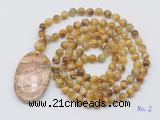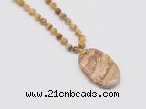 Details: Hand-knotted tiger eye mala necklaces: 108 8mm/10mm round golden tiger eye beads with picture jasper pendant/12mm guru bead and picture jasper pendant (you can choose different pendants, but there will be tiny different in shape & color, we will make the jewelry randomly according to our stock) Item: GMN5073 Material: No.1: 8mm: 108 8mm golden tiger eye beads & picture jasper pendant 10mm: 108 10mm golden tiger eye beads & picture jasper pendant No.2: 8mm: 108 8mm golden tiger eye beads, 12mm guru bead & picture jasper pendant 10mm: 108 10mm golden tiger eye beads, 12mm guru bead & picture jasper pendant Color: See image Length (inch): Necklace length: 8mm: approx 37 - 40 inches (Not including guru bead & pendant) 10mm: approx 46 - 50 inches (Not including guru bead & pendant) Quantity Discount Pricing: 1 - 4: None 5 - 49: 95% 50 - 99: 90% 100+: 85% This mala is available in both 8mm and 10mm beads, The listed price is for 1 piece 8mm mala necklace Each necklaces is handmade and hand-knotted with different gemstones. Please be aware that each necklace varies in stone pattern and color - Making it a truly one-of-a-kind, unique piece of jewelry. Custom orders are available upon request! If you see different stones you like/want incorporated into a mala necklace or you have any need, please contact us before you placing order or leave remark, and we will be happy to create a mala just for you! Mala necklace is worn on the neck or wrist while not in use. It may also serve as a nice accessory in everyday life or on some special occasions. Whether as a calming meditation guide or a beautiful, this necklace will be a great addition to your spiritual practice.
