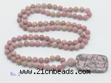 Details: Hand-knotted jasper mala necklaces: 108 8mm/10mm round matte pink wooden fossil jasper beads with rhodonite pendant/12mm guru bead and rhodonite pendant (you can choose different pendants, but there will be tiny different in shape & color, we will make the jewelry randomly according to our stock) Item: GMN5120 Material: No.1: 8mm: 108 8mm matte pink wooden fossil jasper beads & rhodonite pendant 10mm: 108 10mm matte pink wooden fossil jasper beads & rhodonite pendant No.2: 8mm: 108 8mm matte pink wooden fossil jasper beads, 12mm guru bead & rhodonite pendant 10mm: 108 10mm matte pink wooden fossil jasper beads, 12mm guru bead & rhodonite pendant Color: See image Length (inch): Necklace length: 8mm: approx 37 - 40 inches (Not including guru bead & pendant) 10mm: approx 46 - 50 inches (Not including guru bead & pendant) Quantity Discount Pricing: 1 – 4: None 5 – 49: 95% 50 – 99: 90% 100+: 85% This mala is available in both 8mm and 10mm beads, The listed price is for 1 piece 8mm mala necklace Each necklaces is handmade and hand-knotted with different gemstones. Please be aware that each necklace varies in stone pattern and color - Making it a truly one-of-a-kind, unique piece of jewelry. Custom orders are available upon request! If you see different stones you like/want incorporated into a mala necklace or you have any need, please contact us before you placing order or leave remark, and we will be happy to create a mala just for you! Mala necklace is worn on the neck or wrist while not in use. It may also serve as a nice accessory in everyday life or on some special occasions. Whether as a calming meditation guide or a beautiful, this necklace will be a great addition to your spiritual practice.