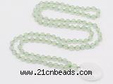Details: Hand-knotted prehnite mala necklaces: 108 8mm/10mm round grade AA prehnite beads with white crystal pendant/12mm guru bead and white crystal pendant (you can choose different pendants, but there will be tiny different in shape & color, we will make the jewelry randomly according to our stock) Item: GMN5146 Material: No.1: 8mm: 108 8mm prehnite beads & blue chalcedony pendant 10mm: 108 10mm prehnite beads & blue chalcedony pendant No.2: 8mm: 108 8mm prehnite beads, 12mm guru bead & blue chalcedony pendant 10mm: 108 10mm prehnite beads, 12mm guru bead & blue chalcedony pendant Color: See image Length (inch): Necklace length: 8mm: approx 37 - 40 inches (Not including guru bead & pendant) 10mm: approx 46 - 50 inches (Not including guru bead & pendant) Pendants: approx 30*40mm Quantity Discount Pricing: 1 - 4: None 5 - 49: 95% 50 - 99: 90% 100+: 85% This mala is available in both 8mm and 10mm beads, The listed price is for 1 piece 8mm mala necklace Each necklaces is handmade and hand-knotted with different gemstones. Please be aware that each necklace varies in stone pattern and color - Making it a truly one-of-a-kind, unique piece of jewelry. Custom orders are available upon request! If you see different stones you like/want incorporated into a mala necklace or you have any need, please contact us before you placing order or leave remark, and we will be happy to create a mala just for you! Mala necklace is worn on the neck or wrist while not in use. It may also serve as a nice accessory in everyday life or on some special occasions. Whether as a calming meditation guide or a beautiful, this necklace will be a great addition to your spiritual practice.