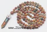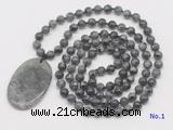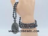 Details: Hand-knotted labradorite mala necklaces: 108 8mm/10mm round black labradorite beads with labradorite pendant/12mm guru bead and labradorite pendant (you can choose different pendants, but there will be tiny different in shape & color, we will make the jewelry randomly according to our stock) Item: GMN5178 Material: No.1: 8mm: 108 8mm black labradorite beads & labradorite pendant 10mm: 108 10mm black labradorite beads & labradorite pendant No.2: 8mm: 108 8mm black labradorite beads, 12mm guru bead & labradorite pendant 10mm: 108 10mm black labradorite beads, 12mm guru bead & labradorite pendant Color: See image Length (inch): Necklace length: 8mm: approx 37 - 40 inches (Not including guru bead & pendant) 10mm: approx 46 - 50 inches (Not including guru bead & pendant) Pendants: approx 35*55mm Quantity Discount Pricing: 1 - 4: None 5 - 49: 95% 50 - 99: 90% 100+: 85% This mala is available in both 8mm and 10mm beads, The listed price is for 1 piece 8mm mala necklace Each necklaces is handmade and hand-knotted with different gemstones. Please be aware that each necklace varies in stone pattern and color - Making it a truly one-of-a-kind, unique piece of jewelry. Custom orders are available upon request! If you see different stones you like/want incorporated into a mala necklace or you have any need, please contact us before you placing order or leave remark, and we will be happy to create a mala just for you! Mala necklace is worn on the neck or wrist while not in use. It may also serve as a nice accessory in everyday life or on some special occasions. Whether as a calming meditation guide or a beautiful, this necklace will be a great addition to your spiritual practice.