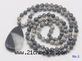 Details: Hand-knotted jasper mala necklaces: 108 8mm/10mm round black water jasper beads with agate pendant/12mm guru bead and agate pendant (you can choose different pendants, but there will be tiny different in shape & color, we will make the jewelry randomly according to our stock) Item: GMN5224 Material: No.1: 8mm: 108 8mm black water jasper beads & agate pendant 10mm: 108 10mm black water jasper beads & agate pendant No.2: 8mm: 108 8mm black water jasper beads, 12mm guru bead & agate pendant 10mm: 108 10mm black water jasper beads, 12mm guru bead & agate pendant Color: See image Length (inch): Necklace length: 8mm: approx 37 - 40 inches (Not including guru bead & pendant) 10mm: approx 46 - 50 inches (Not including guru bead & pendant) Pendants: approx 35*55mm Quantity Discount Pricing: 1 – 4: None 5 – 49: 95% 50 – 99: 90% 100+: 85% This mala is available in both 8mm and 10mm beads, The listed price is for 1 piece 8mm mala necklace Each necklaces is handmade and hand-knotted with different gemstones. Please be aware that each necklace varies in stone pattern and color - Making it a truly one-of-a-kind, unique piece of jewelry. Custom orders are available upon request! If you see different stones you like/want incorporated into a mala necklace or you have any need, please contact us before you placing order or leave remark, and we will be happy to create a mala just for you! Mala necklace is worn on the neck or wrist while not in use. It may also serve as a nice accessory in everyday life or on some special occasions. Whether as a calming meditation guide or a beautiful, this necklace will be a great addition to your spiritual practice.
