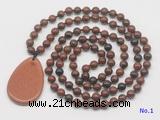 Details: Hand-knotted obsidia mala necklaces: 108 8mm/10mm round mahogany obsidian beads with goldstone pendant/12mm guru bead and goldstone pendant (you can choose different pendants, but there will be tiny different in shape & color, we will make the jewelry randomly according to our stock) Item: GMN5237 Material: No.1: 8mm: 108 8mm mahogany obsidian beads & goldstone pendant 10mm: 108 10mm mahogany obsidian beads & goldstone pendant No.2: 8mm: 108 8mm mahogany obsidian beads, 12mm guru bead & goldstone pendant 10mm: 108 10mm mahogany obsidian beads, 12mm guru bead & goldstone pendant Color: See image Length (inch): Necklace length: 8mm: approx 37 - 40 inches (Not including guru bead & pendant) 10mm: approx 46 - 50 inches (Not including guru bead & pendant) Pendants: approx 35*55mm Quantity Discount Pricing: 1 – 4: None 5 – 49: 95% 50 – 99: 90% 100+: 85% This mala is available in both 8mm and 10mm beads, The listed price is for 1 piece 8mm mala necklace Each necklaces is handmade and hand-knotted with different gemstones. Please be aware that each necklace varies in stone pattern and color - Making it a truly one-of-a-kind, unique piece of jewelry. Custom orders are available upon request! If you see different stones you like/want incorporated into a mala necklace or you have any need, please contact us before you placing order or leave remark, and we will be happy to create a mala just for you! Mala necklace is worn on the neck or wrist while not in use. It may also serve as a nice accessory in everyday life or on some special occasions. Whether as a calming meditation guide or a beautiful, this necklace will be a great addition to your spiritual practice.